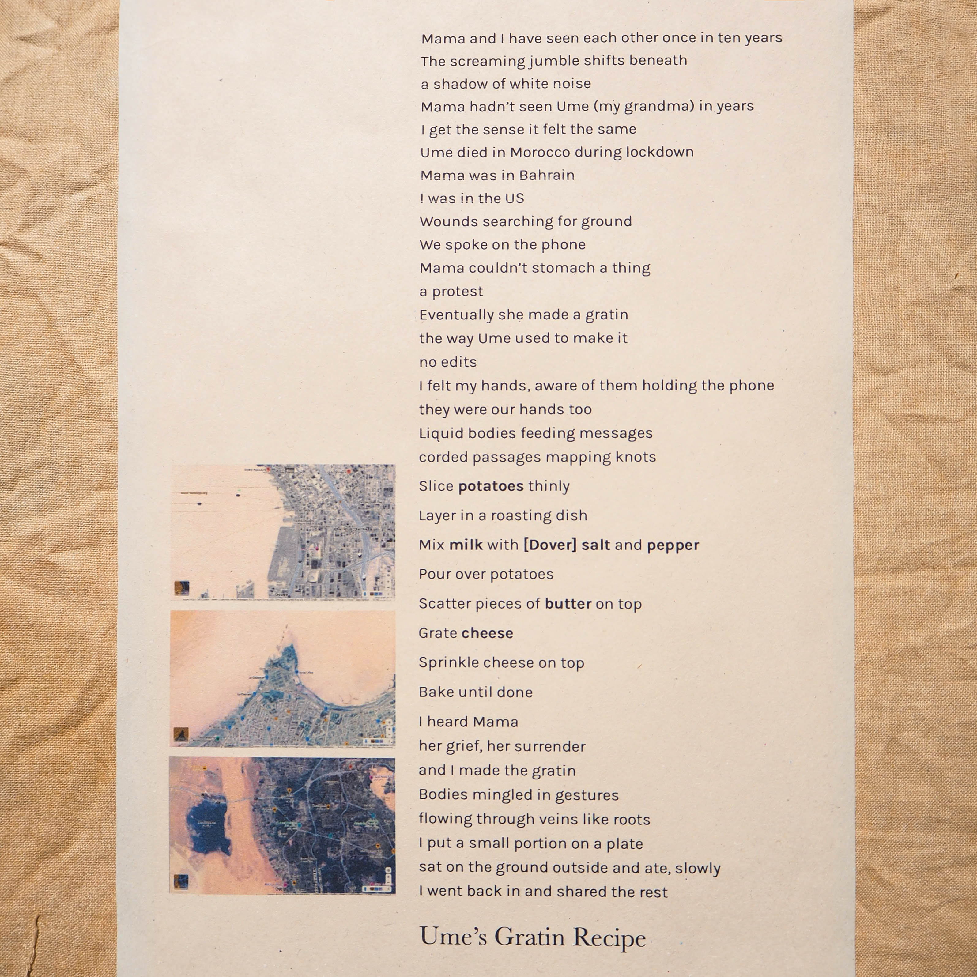 This work is a meditation and investigation on the ocean in relation to separation, belonging, and planetary connectedness. A DIY process of extracting salt from seawater collected in Dover (a border, a passage, an archive) is linked with the preparation of a family gratin recipe. By personally gathering seawater, as well as preparing food and ingesting it, my body performs the past and/in the present, whilst becoming part of the landscape and part of a recipe.